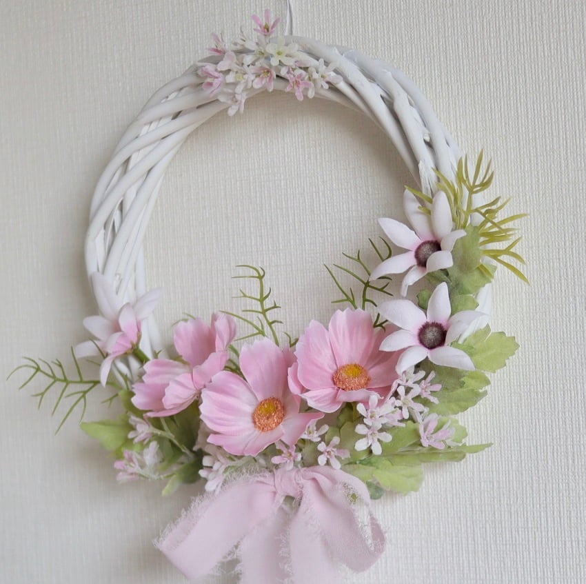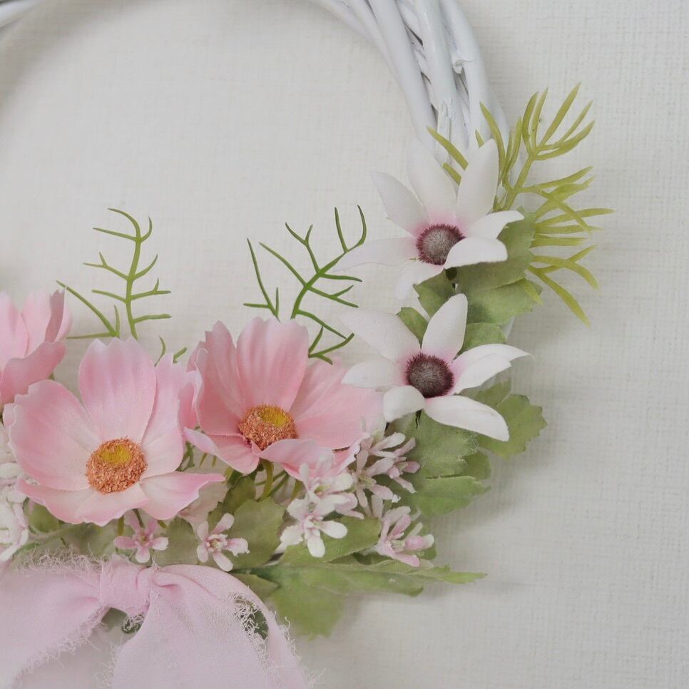 やわらかなニュアンスピンクのコスモスに、白に少しピンクが入ったフェンネルフラワーを合わせた淡色のリースです。