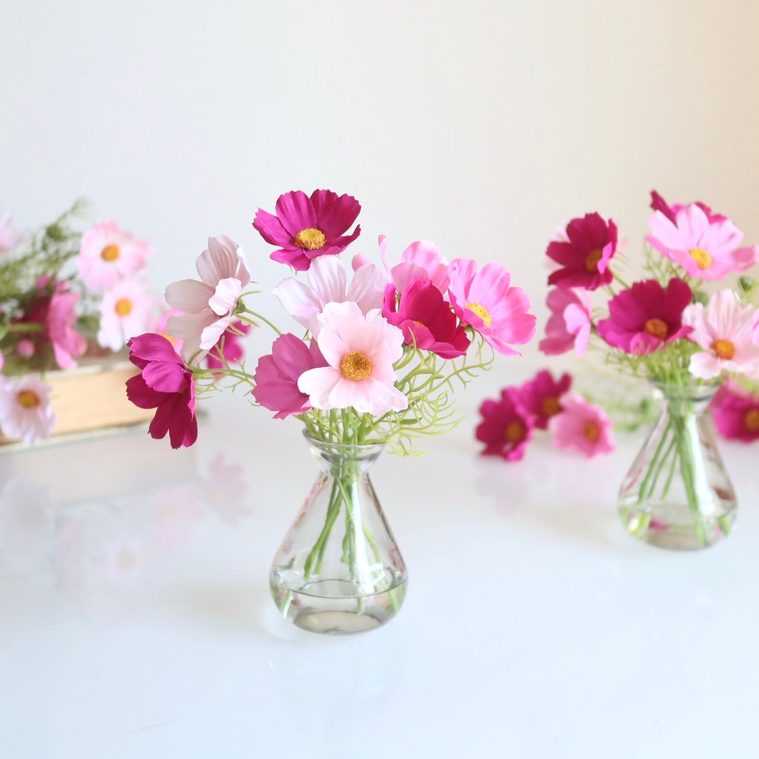 ■コスモスの代表的な色、パープル系ピンク、ピンク、薄いピンクの3色のコスモスを花瓶に生けたアレンジです。