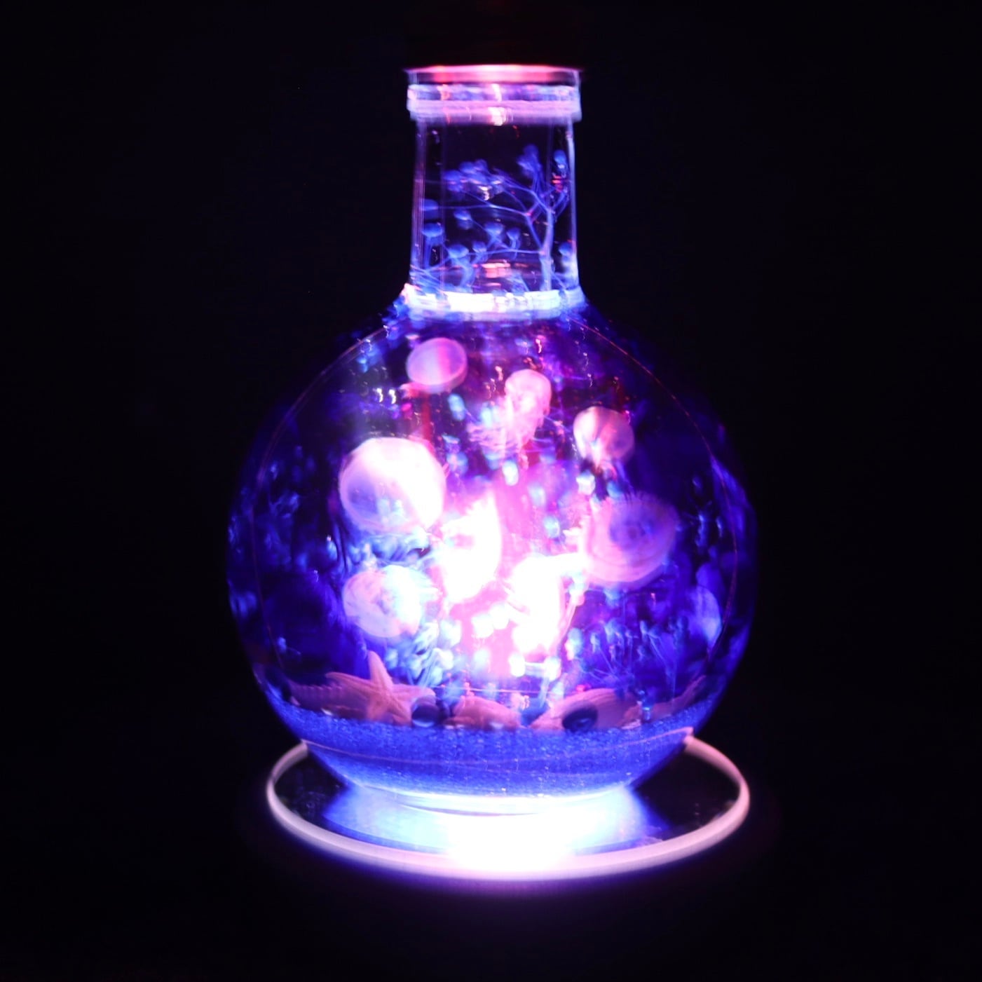 地球のようなガラス瓶はクラゲが自由に生きる青い世界。太陽が差し込むような光で幻想的な雰囲気もお楽しみください。(LEDライト込みのお値段です)