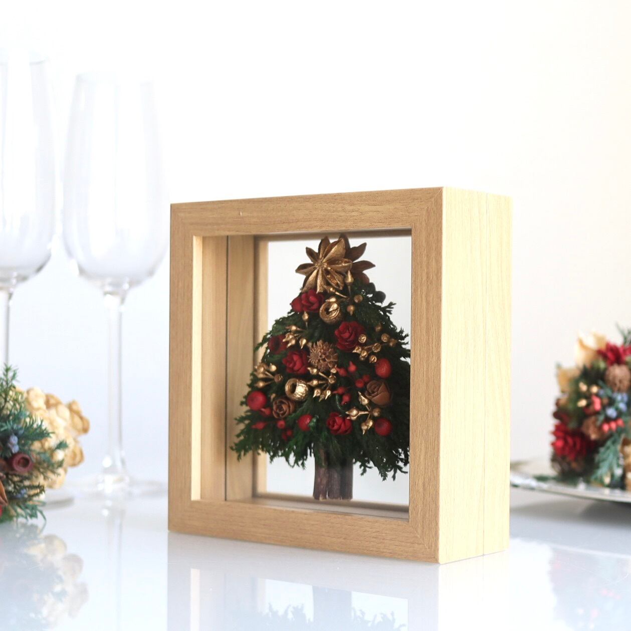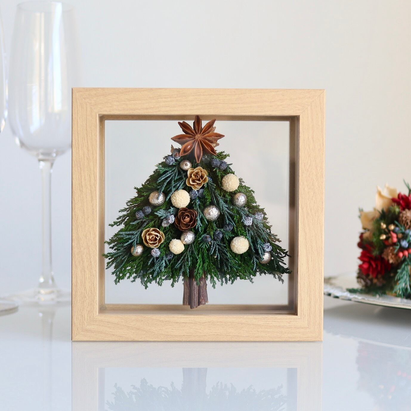 フレームの両サイドにツリーがあるリバーシブルで、色違いのクリスマスツリーが楽しめるようにしています。置く場所によって背景が変わるガラスフレームアレンジ。