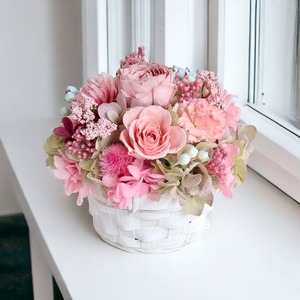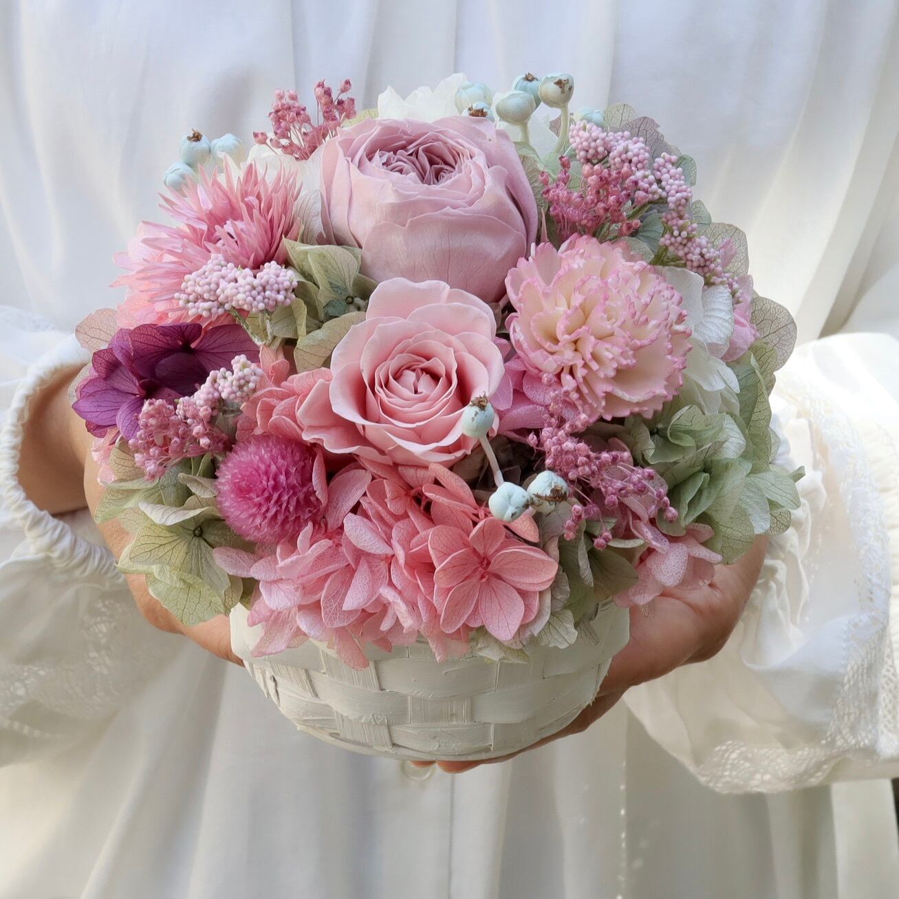 ■お祝いの気持ち溢れるふんわりパリジェンヌの花籠。バラやカーネーション、ニァアンスカラーの紫陽花、たくさんの花が華やかに詰め込まれたお花籠は、贈られた方に幸せな気持ちをお届けします。