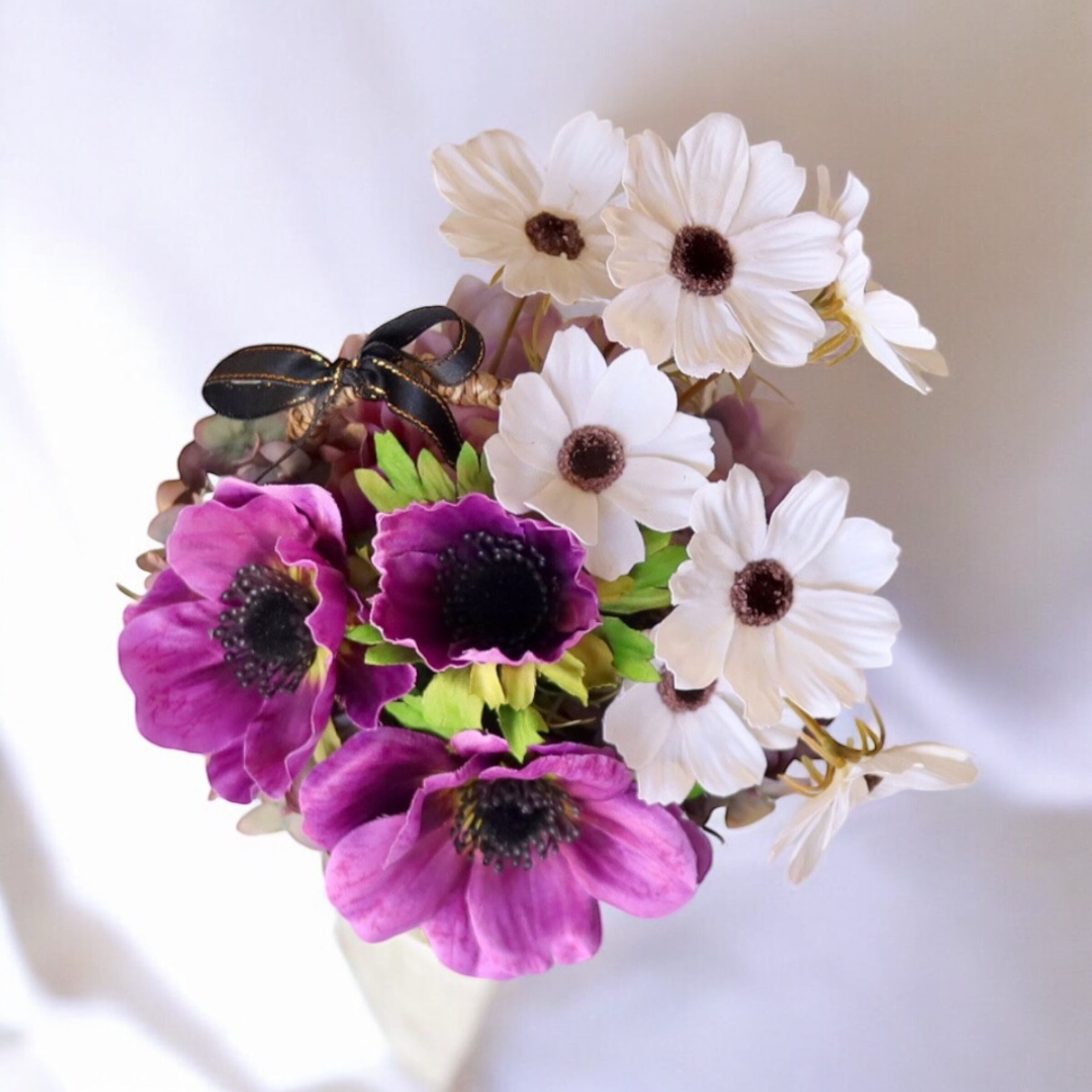 紫のベルベット風の花びらが美しいアネモネと柔らかい白色が可憐なコスモスに秋色の紫陽花を合わせたフラワーアレンジメントです。